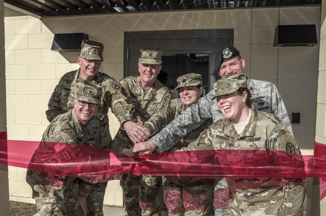 Col. Kevin Nemelka (with the glasses), Brig. Gen. Jeffrey Johnson, Brig. Gen. Erik Torring, Lt. Col. Jacque Parker, Air Force Maj. David Temple and Maj. Andrea Henderson cut the ribbon to the new Sports Medicine Rehabilitation Facility and Hospital Recovery Kennels at the LTC Daniel E Holland Military Working Dog Hospital today. The new facility provides flooring and lighting more suited to protect post-operative patients and minimize their stress. It includes a quiet room, large exercise area and an aquatic therapy room. (Photo Credit: Johnny Saldivar, 502 ABW Public Affairs)
